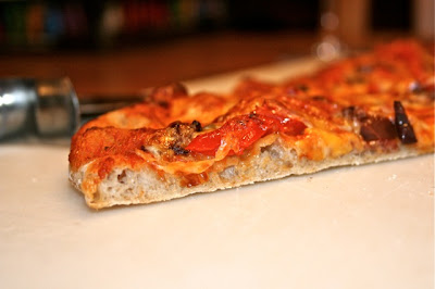 One of the reasons I wanted the tiles to replace my standard pizza stone was the size. The tile lined oven has enough room to bake more than one loaf at a time. And the pizza stone was too small to bake a large pizza like the one shown here.