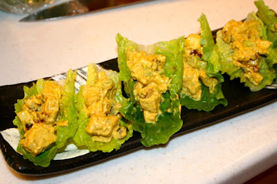 Chicken salad spiced with Indian flavors were a hit on New Year’s Eve. I started by poaching some boneless skinless chicken breasts in salted water just until cooked. This was diced up with some celery and carrots. Walnuts and dried cranberries were added. I made a homemade curry powder with cumin, coriander, turmeric, chili powder, asafoetida and salt. This with a little bit of mayo was the dressing. I served it in bite-sized portions wrapped with romaine lettuce leaves.