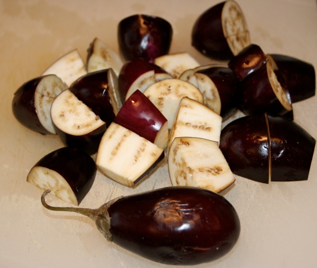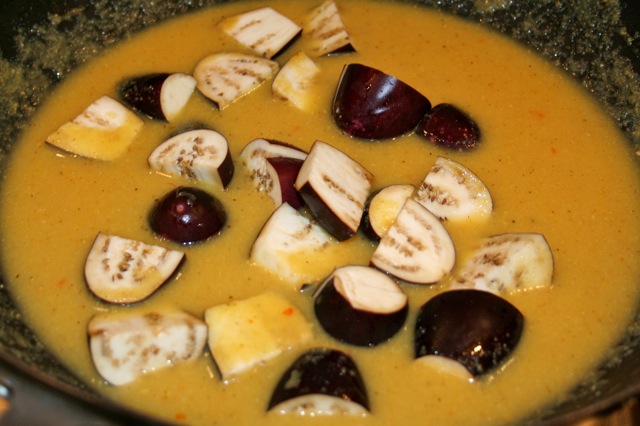 You may know that I am trying to cook light and healthy and take off some of this winter blubber. It is possible to cook healthy but still have tons of flavor. I stopped by my local Asian grocery on the way home from work and happened to find some of those small little round purple eggplants. So I grabbed some. All the way home I was trying to figure out how to make a curry without the fat. I came up with this.