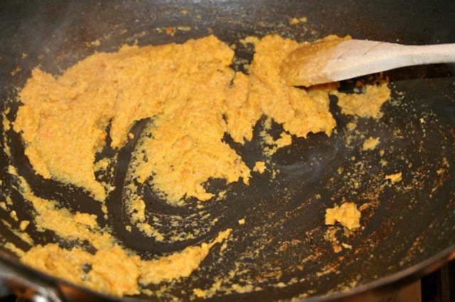 I cooked the paste down for about 5-6 minutes with constant stirring until most of the water from the onion had been cooked out and it began to brown a bit. This gives great color and flavor. You want to cook out the raw onion bitterness. This paste will help thicken my sauce. If I had thought ahead, I would have also thrown in a couple of the raw shrimp into the purée. This would have added another level of flavor to the overall dish. This is a great trick to do in dishes where you want the flavor of ingredients that you really don’t want to stew for a long time.